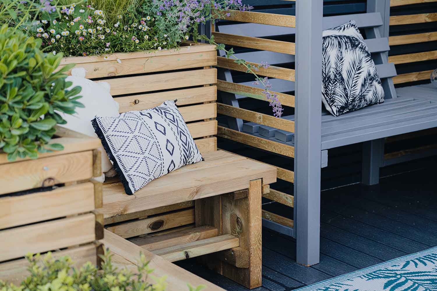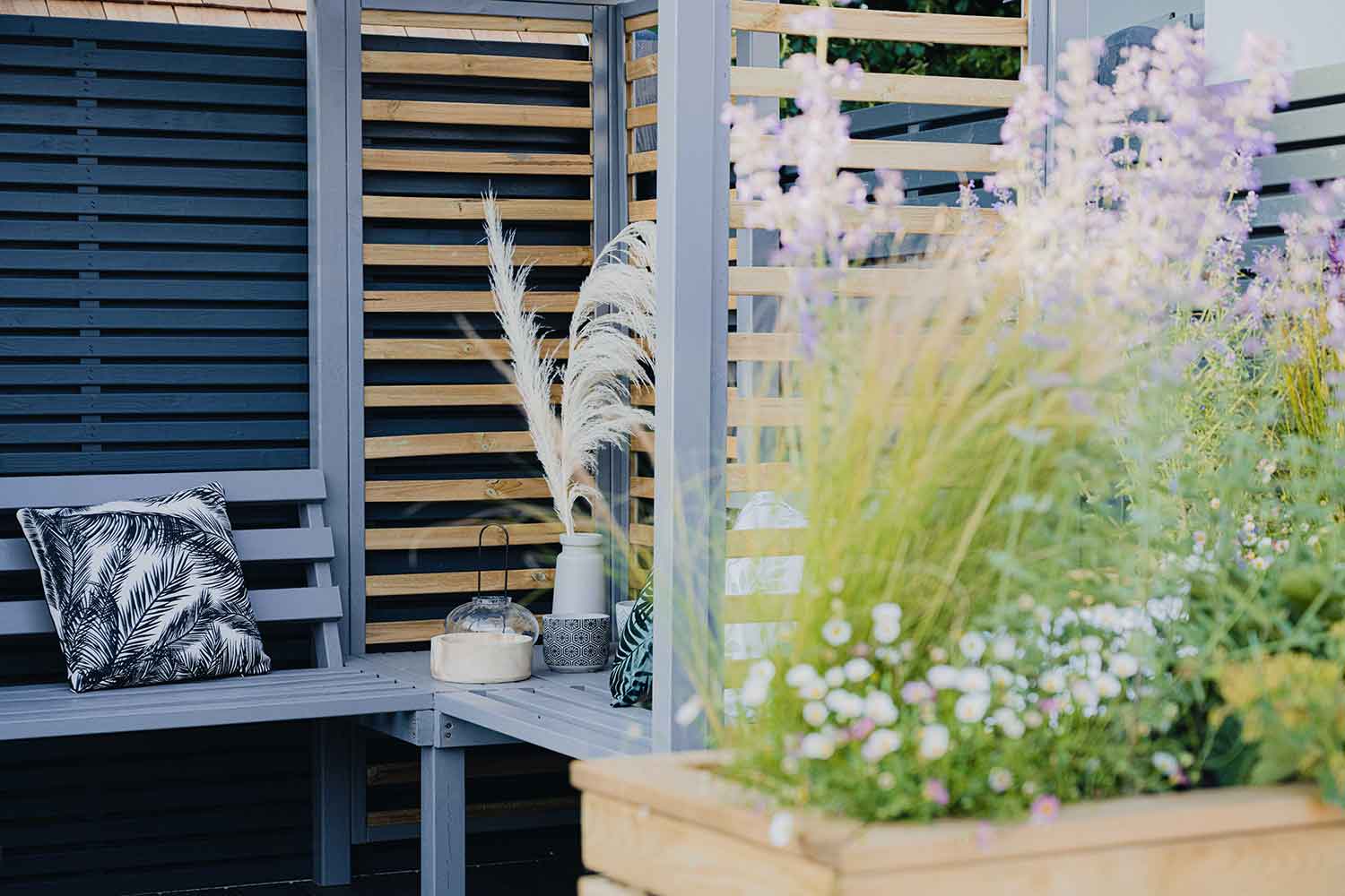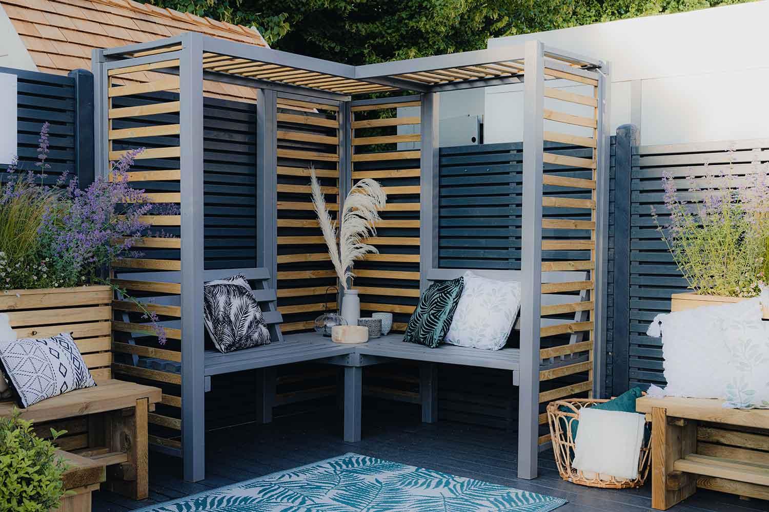 Painted with our RAL 7037 Dusty Grey wood paint for a beautifully elegant place to sit and enjoy the garden.